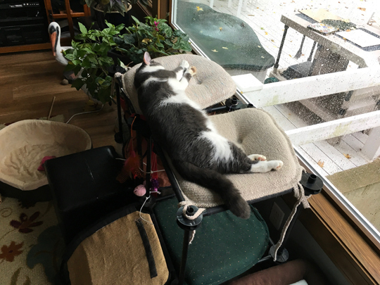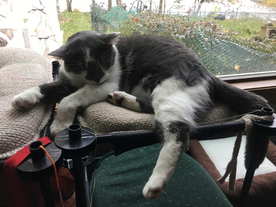 he likes to take advantage of the double-wide top level of the kitty condo, stretching all the way across.