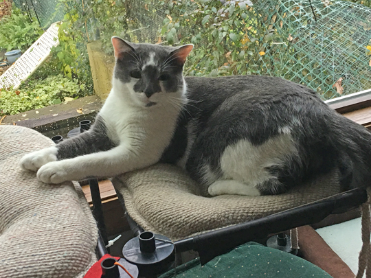 can you see les? he’s peeking out from the middle level of the condo as riley peers down at him. they do lie around on every section except that middle green pillow, for some reason they don’t care for that.