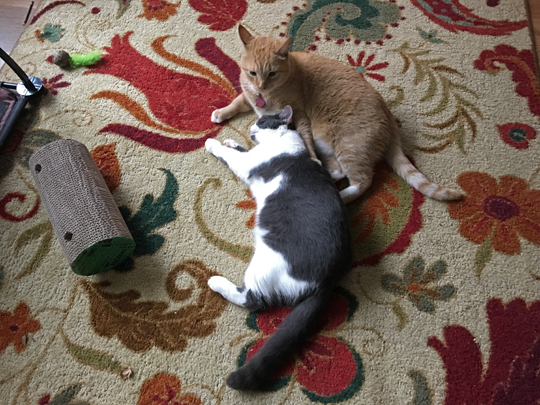 riley and les being loving before the fighting starts. that thing on the right is a rolly ball filled with catnip, perfect for cats, right? especially riley, who has all of his claws and uses the couch as a scratching post. but of course not, they won’t have anything to do with it. because they’re cats.