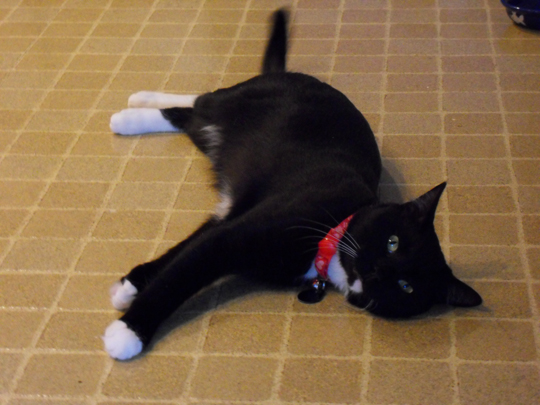 chester prefers to roll around on the kitchen floor in front of the heat vent. he meows at me every once in a while.