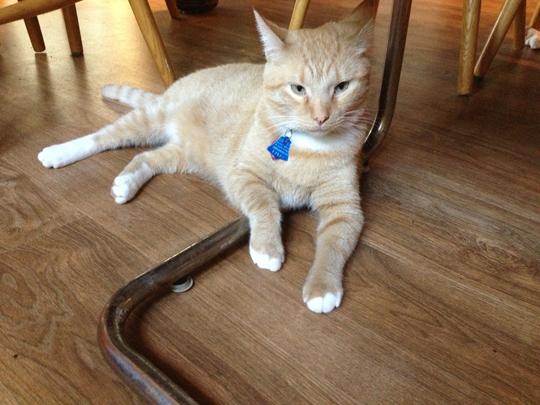 and here’s les paul, looking suspiciously at it under the dining room table. that’s as close as he’d get.