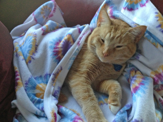 here is lester, snuggling under a blanket yesterday when it was cold, cold, cold.