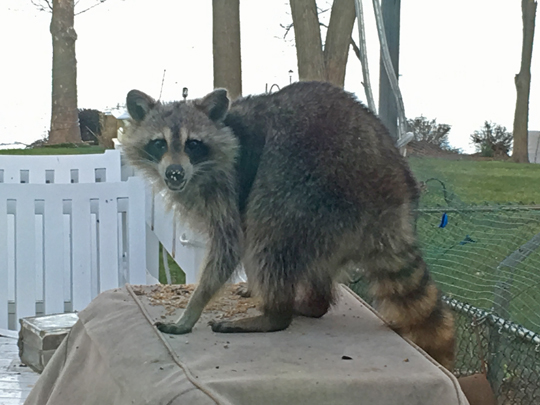 early in the evening, when it was still light out, this raccoon appeared on the deck. look at his smile! if you inspect it closely you’ll see the bird seeds stuck to the end of his nose (I didn’t even see it, but Bev pointed it out to me). it looks like he’s grinning!