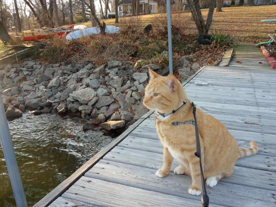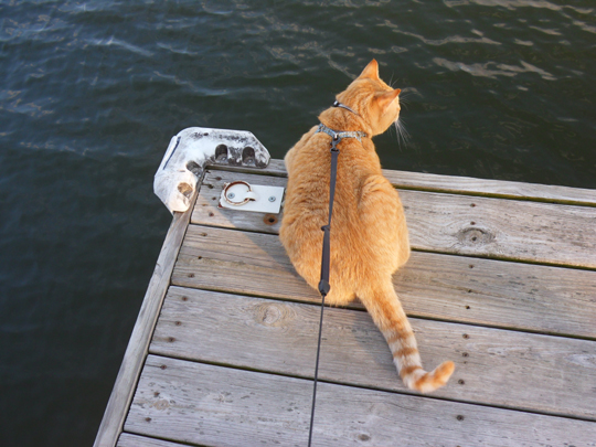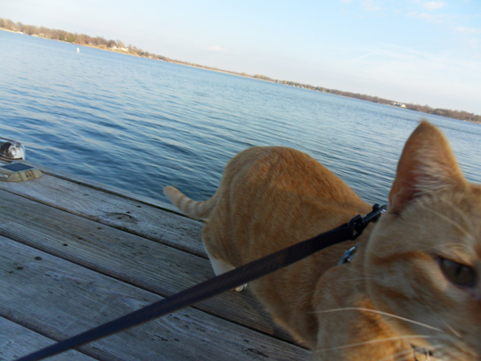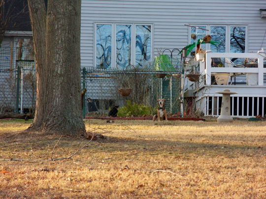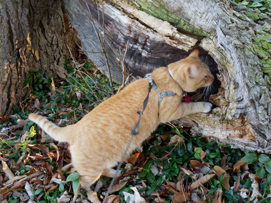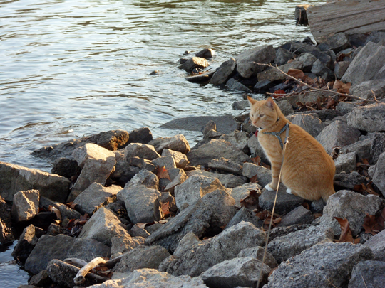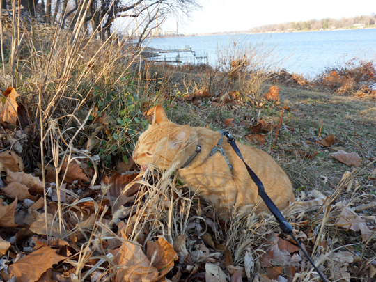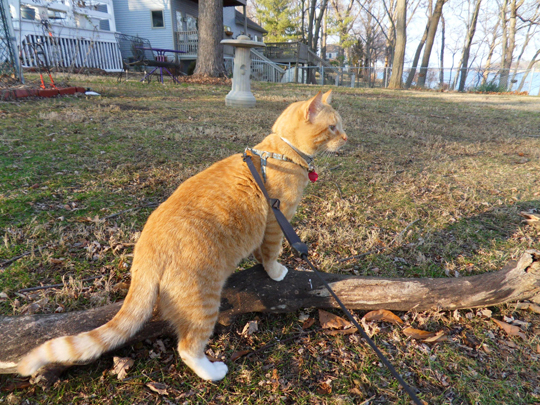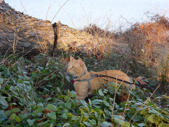 meanwhile, poor little chester had gone out into the fenced yard and meowed sadly down at us. i will never even try to put him on the leash, sinc he really doesn’t even like to be picked up. it would be disasterous. you can just barely see chester, to the left of mollie, who had decided she’d had enough of the whole walk thing.