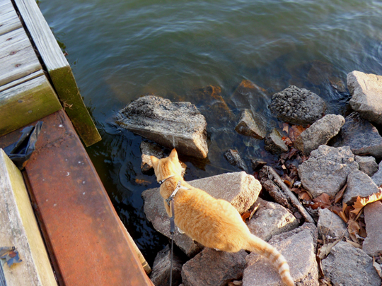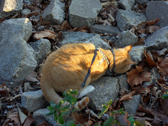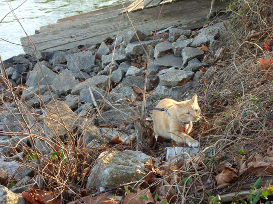 i wasn’t about to climb down on the rocks because of the certainty of falling, and at this point lester is pretty well wrapped around that little bush.