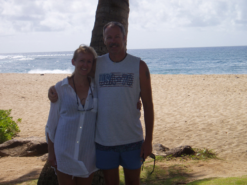 this is me and kevin, at the place where we thought amy and jim got married. it’s near the hyatt resort on kauai. i talked to mom on the phone a few times about where, exactly, they got married, and we reallly thought this was the place and got a woman to take our picture. but then i talked to amy later and that wasn’t the place at all. we did finally manage to find the REAL wedding spot, but by then we were tired of looking so kevin just took a picture of it, we didn’t bother trying to find somebody to take our picture together.