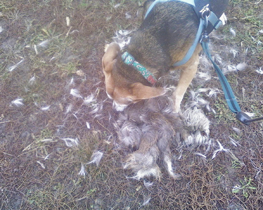 i started yelling at her, and mollie is pretty deaf now, but i know she could hear me because i was bellowing at the top of my lungs. the deer were long gone, but she trotted right out to the middle of the field and started vigorously gnawing on something. uh oh…it was obviously a dead something and she clearly planned to stay there and enjoy every delicious morsel.
