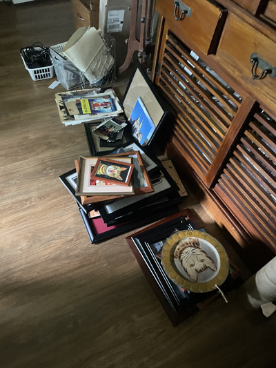 I took all the photos out of the tub, and here they are. One the bottom are two piles of framed photos, and then there are frames without pictures and pictures without frames that I don’t care about so at least I can put that away. But the next pile is a big stack of things that I want to put in frames, but where on earth do I think I’m going to hang them? No time to worry about it now…
