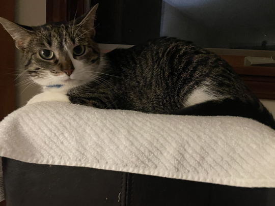 Saturday I was working out in the bedroom and Riley there with me but suddenly he meowed to get into the other part of the house – Riley rarely meows. So I followed him into the living room, and Princess was at the end of the hall. She just looked at him, but he hustled back into the back of the house and spent the rest of the day in the basement.