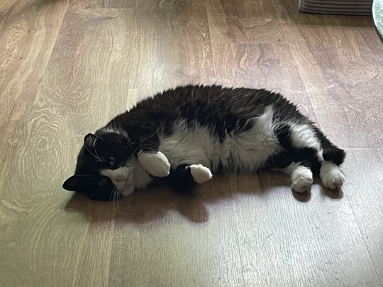 Lovey, stretched out on the living room floor on an evening before she was terrorized and spends most of her time out in the blistering heat. hiding under the forsythia bushes or under the hostas. Poor kitty.