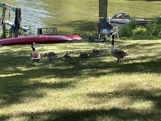 Even though I don’t know when we’ll ever get to take another vacation, at least it’s very vacation-getaway-like around here. Here’s a pair of geese with their adolescent goslings at the end of June.