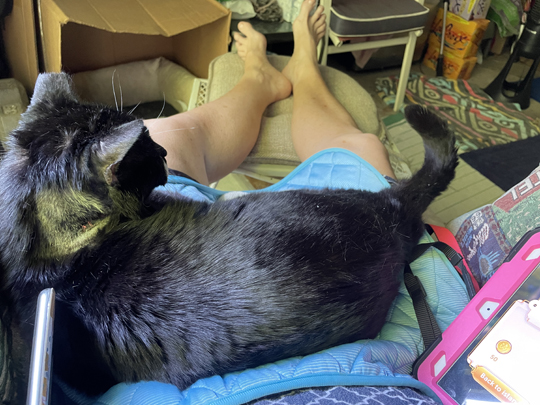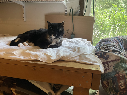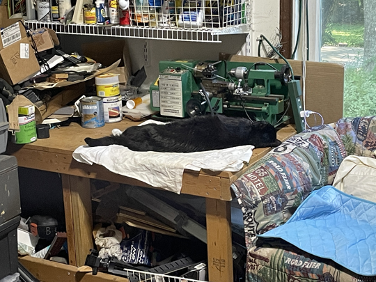 He was happy to sprawl on the partially-cleared workbench with that giant green thing behind him. It’s some kind of…press? Some kind of thing for making things is my guess.