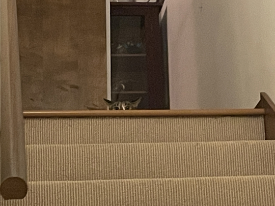 Ha ha, tiny Princess Leia peeking down at me from the top of the stairs. She really likes to hide and play and race around and scamper up and down the stairs. Still not integrated with everybody, though, and it’s now been five months…