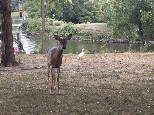 Deer with white goose in the background. The white goose has taken off now, and we hope that it has found other geese who it can be friends with. Gee, the grass was brown back then. It didn’t rain forever then it finally rained. It hasn’t rained so much lately but at least the grass is green at the moment.