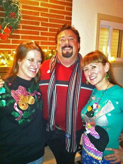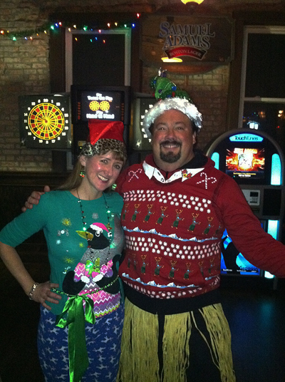 it’s hard to see randy’s jacket so well, but it has reindeers in grass skirts on it, among other things. that’s why he’s wearing a grass skirt. and his hat is pretty fabulous, an xmas tree, but you can’t tell so well here.