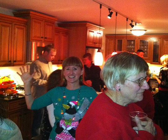 bev and i are thusly attired because we were next headed to an ugly xmas sweater party. this is in front of bill and linda’s new fireplace. beautiful. randy didn’t wear his ugly sweater to the first party, for some reason.