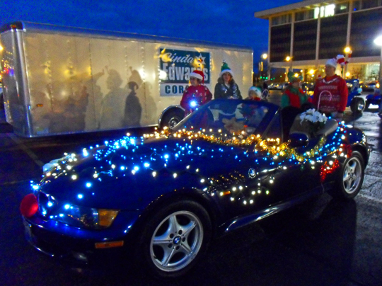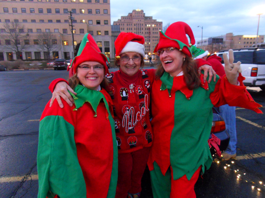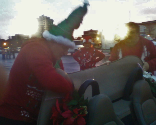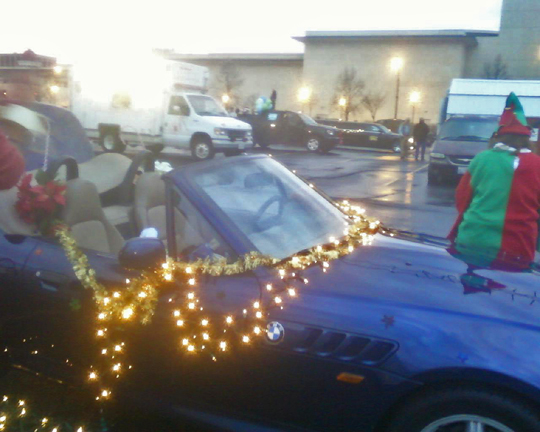 the parade started at 5 p.m. on saturday and we were supposed to be there by 4. randy didn’t get to my house til late, and then he had to stop for gas, but we got there a little after four and then it was a mad flurry of activity trying to decorate the car. there in the back on the right is either bev or janice, getting into an elf costume. i think that’s before janice arrive, so it must be bev. randy insisted that she wear the elf shoes but they were flimsy felt shoes with thin fake leather soles, and the pavement was very wet so poor bev’s feet must have been FREEZING.