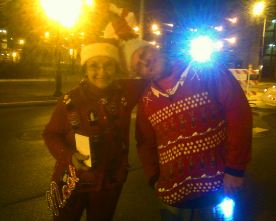 he won FIRST PRIZE at the ugly sweater party! i was one of the four runners-up, although i wasn’t even wearing a sweater. by the time i finally made it to goodwill to buy one, they were COMPLETELY SOLD OUT. so i bought a large kids size t-shirt that i thought was fabulously awful. i added my cool light up xmas bulb necklace and my hat that i bought to wear in the parade, plus my big red slipper boots that randy bought me last xmas. i also found a pair of wonderful fleece pajama bottoms to complete my ensemble.