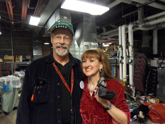 me and kevin, before the show, in the incredibly hot and loud utility room at the hoogland. he has his special little lights on his hat, and when he stood backstage running the projector i could see those little lights burning cheerfully at me.