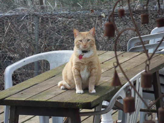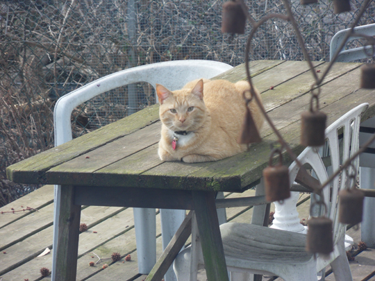 and at the end of march, les watches me from one of his most favorite perches, on top of the picnic table. most of the snow was already gone.