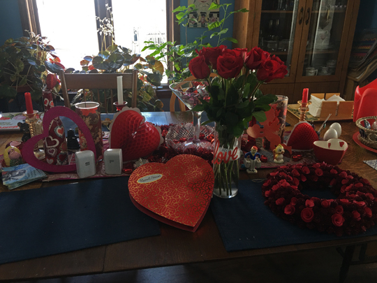 here’s all our valentine’s stuff – the beautiful roses and the big box of chocolates are from kevin, and i dug up all our valentine’s decorations a couple weeks ago and i guess they’ll stay there til i return.