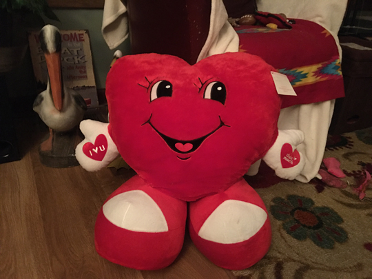 i bought this cute plush heart for kevin a year or two ago and forgot all about it, but when i remembered it i found it tucked away in an upstairs bedroom. so cute!